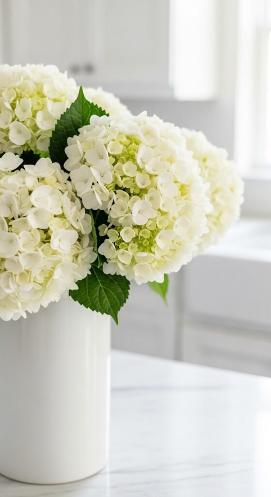 Keep it simple with a cluster of all-white hydrangeas in a clean white vase. Cut stems at a 45-degree angle before placing them in water. This increases water absorption and slows wilting. Fill the vase with cool water mixed with a small pinch of sugar and a drop of bleach. Change the water every two days. White hydrangeas look stunning on a dining table or entryway console. They’re easy to find at most grocery stores for under $10 a bunch.