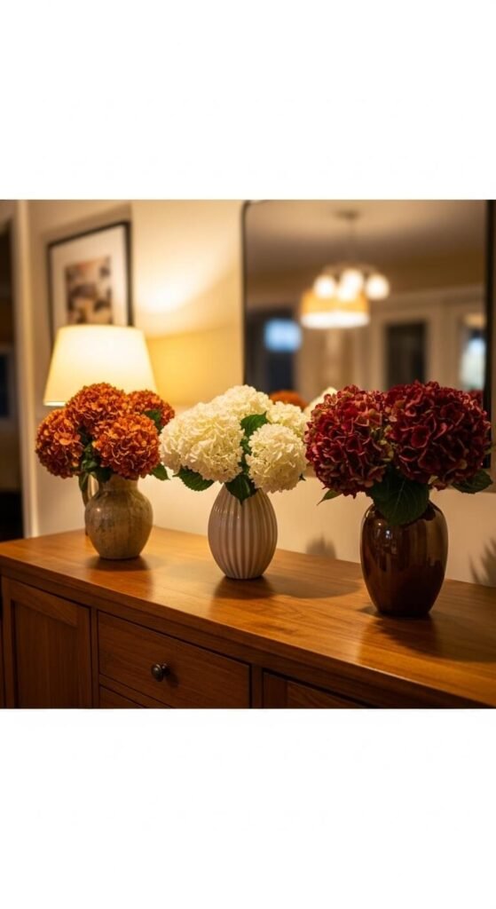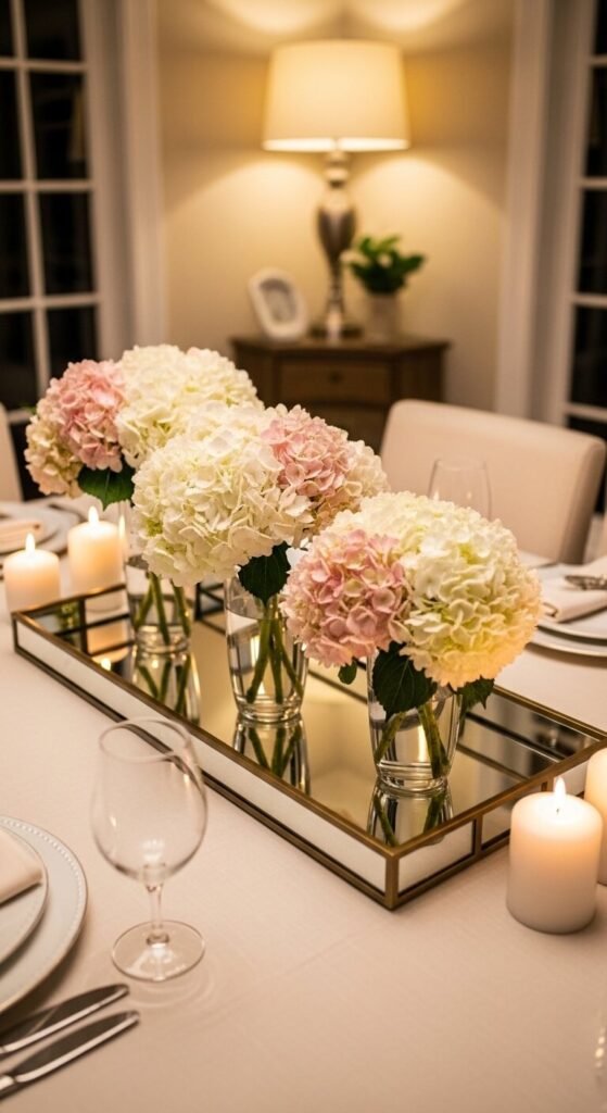 Place your hydrangea vases on a mirrored tray to double the visual impact instantly. The reflection underneath makes a small arrangement look twice as full. Use two or three different vase heights for dimension. Add a few pillar candles on either side to create a complete tablescape. Mirrored trays are available at home goods stores for $10–$20, or check thrift stores for ornate vintage versions. This setup is perfect for dinner parties or holiday tables and requires minimal flowers to look impressive.