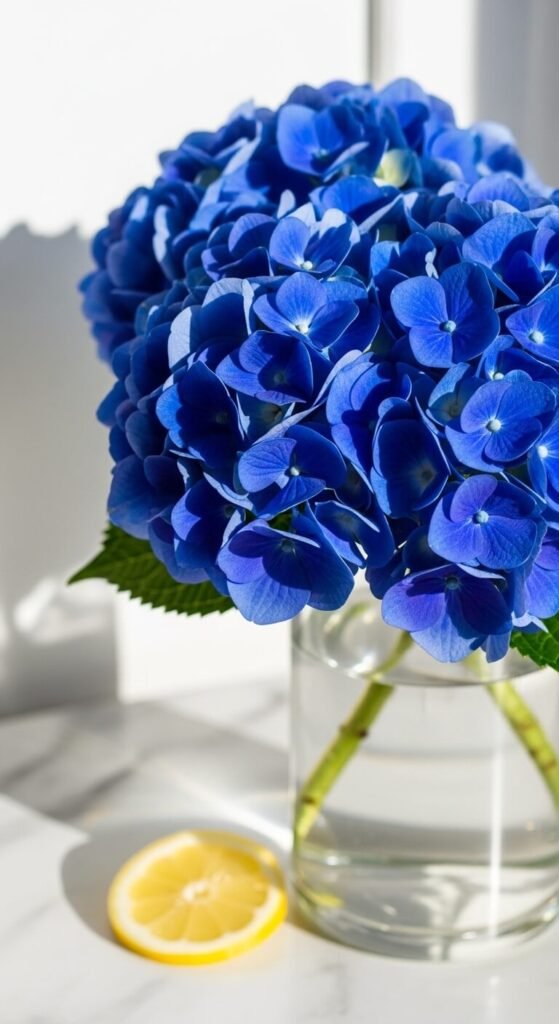 Blue hydrangeas are pH-sensitive — they can shift or fade in the wrong water. Adding a small squeeze of lemon juice or a splash of white vinegar to the vase water keeps the pH slightly acidic, which helps maintain deep blue and purple tones. This won’t change white flowers, but it makes a real difference with blue and purple varieties. Change the acidic water every two days and re-cut the stems. It’s a zero-cost hack that works every single time using things you already have at home.