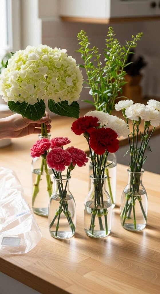 Most grocery store bouquets mix hydrangeas with carnations or lilies. The problem? Different flowers prefer different water conditions, and mixing them can shorten hydrangea life significantly. As soon as you get home, separate your hydrangeas into their own vase. Rearrange the other flowers in a separate container. This one step can add three to four extra days of life to your hydrangeas. You end up with two distinct arrangements from one $10 bouquet — a smart way to stretch your flower budget.