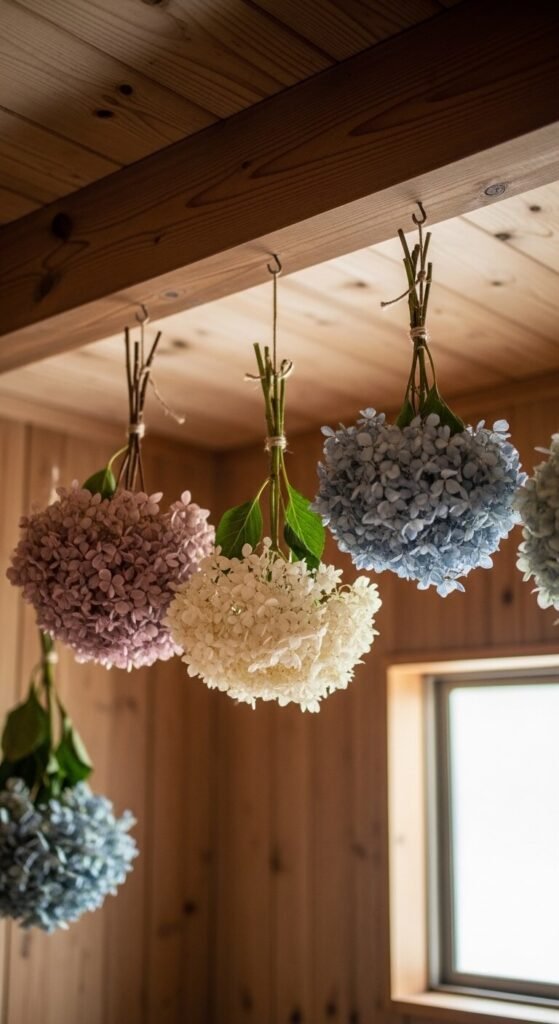 Hanging hydrangeas upside-down turns a fresh arrangement into a long-lasting dried display. Rubber-band three to five stems together and hang them in a dark, airy space — a closet, pantry, or spare room works well. Avoid direct sunlight during drying, which fades the colors quickly. After two to three weeks, the blooms are paper-dry and fully preserved. Move them to a vase, wreath, or frame. A bundle of dried hydrangeas lasts a year or more and costs nothing extra beyond the original flowers.