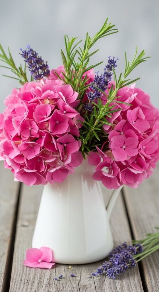 Mixing hydrangeas with fresh herbs like rosemary, lavender, or mint creates a multi-sensory arrangement. The herbs release natural antimicrobial oils into the water, which actually helps keep bacteria down and extends the life of your blooms. Lavender and hydrangeas together smell extraordinary. Add three or four herb stems around the outside of your arrangement. If you grow herbs in your garden or on a windowsill, this addition is completely free. It also makes your kitchen or dining room smell wonderful.