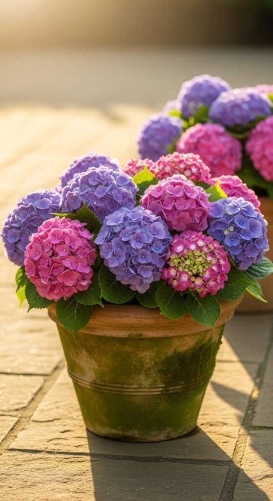 Line a small terracotta pot with a plastic bag, fill it with water, and arrange hydrangeas inside to mimic a potted garden plant. Pack the stems tightly so they hold each other upright. Add a few leafy stems or fern fronds around the edges to fill gaps and reinforce the planted look. This style works beautifully on a front porch or outdoor table. Terracotta pots cost $1–$5 at garden centers. The faux-planted look is far more impressive than it sounds and takes about five minutes to put together.