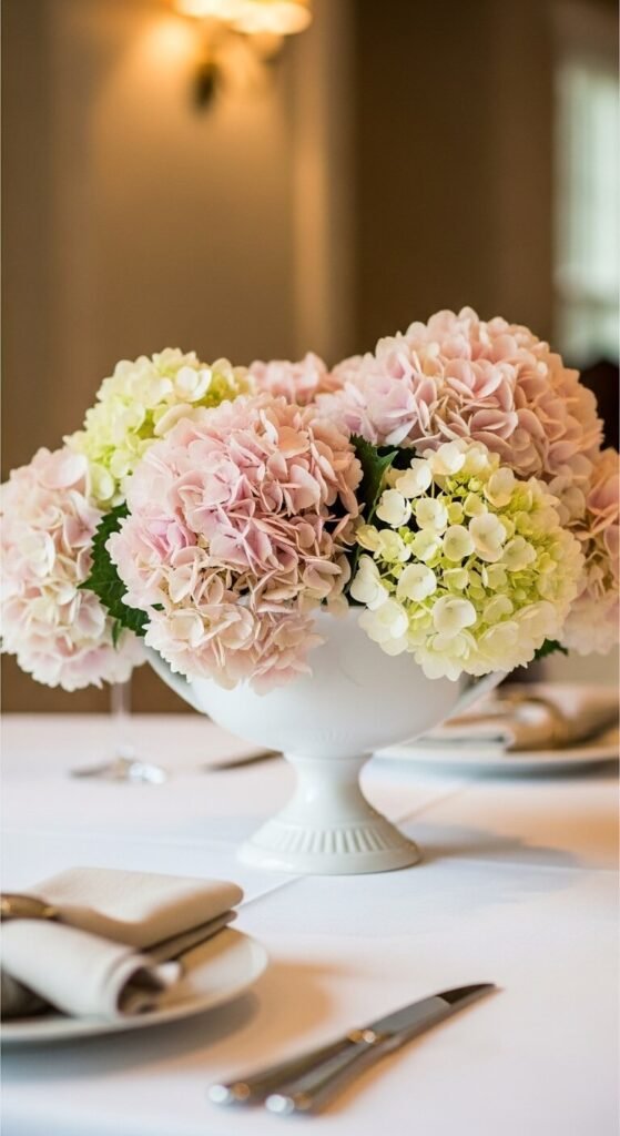 A footed compote vase gives hydrangeas an elevated, formal look that’s perfect for special occasions. The raised base adds height without needing tall stems. Pack blooms tightly into the bowl so they form a round, dome-shaped arrangement. This style suits wedding tables, bridal showers, and holiday dinners. Footed compotes are available at thrift stores for $5–$15. If you don’t have one, invert a bowl and place a smaller vase on top — a budget-friendly DIY version that achieves the same elevated effect.