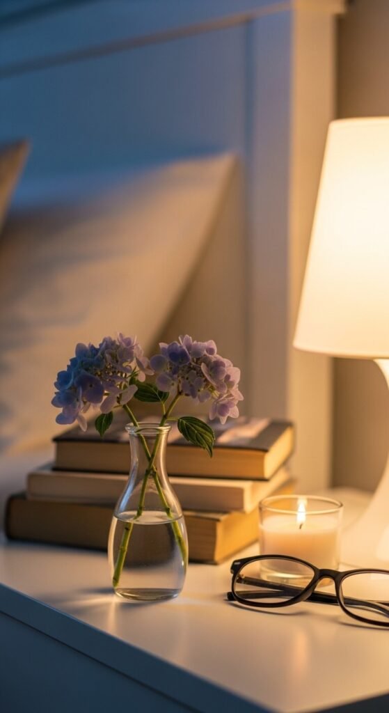 A small hydrangea arrangement on a nightstand is one of the most calming and affordable bedroom upgrades. Use just two or three stems in a tiny vase or glass to keep the scale right for a small surface. Lavender or blush hydrangeas are especially soothing in a bedroom setting. Keep the vase away from direct heat sources like a lamp or radiator — heat wilts hydrangeas fast. Change the water every other day without fail in small vessels. The entire setup costs under $5 if you have a spare glass.