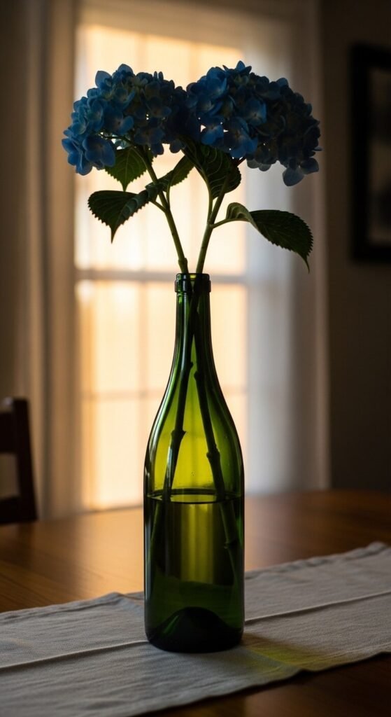 An empty wine bottle is actually a great hydrangea vase. The narrow neck supports one or two stems perfectly without any foam or wire. Peel off the label, fill with cool water, and place long-stemmed hydrangeas inside. The dark glass helps protect the water from light, which slows algae and bacteria growth. A deep green or cobalt blue bottle makes a particularly striking display. This is a completely free upcycle that produces a genuinely stylish result. Add a second bottle at a different height for a paired look.
