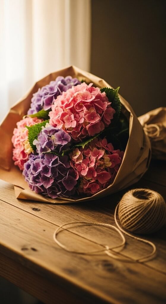 Recreate that farmers market feel at home with an oversized, loosely wrapped bundle. Mix two or three hydrangea colors — blush pink, soft lavender, and cream work beautifully together. Wrap the lower stems in kraft paper tied with twine and place them in a wide-mouth mason jar. Trim the stems under running water before arranging. This style looks intentionally casual and costs very little to pull off. It’s perfect for kitchen counters or a mudroom shelf.