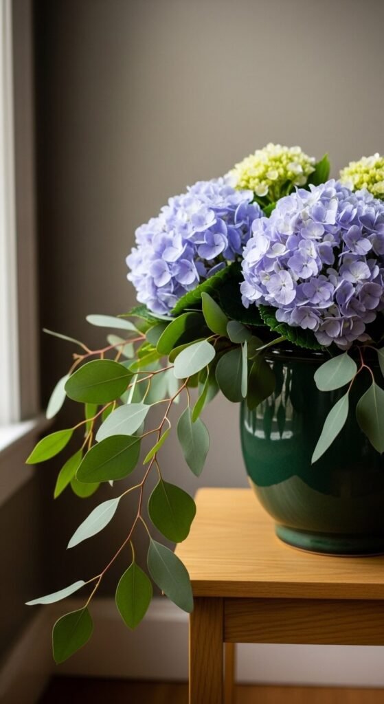 Pairing hydrangeas with eucalyptus is one of the easiest ways to make an arrangement look expensive. Eucalyptus releases natural antibacterial compounds that actually help keep your water cleaner and your blooms fresher. Add three or four eucalyptus stems around the outer edge of your arrangement. Silver dollar and seeded eucalyptus both work well. You can find eucalyptus bundles at Trader Joe’s or Whole Foods for around $3–$5. This combo smells incredible and photographs beautifully.