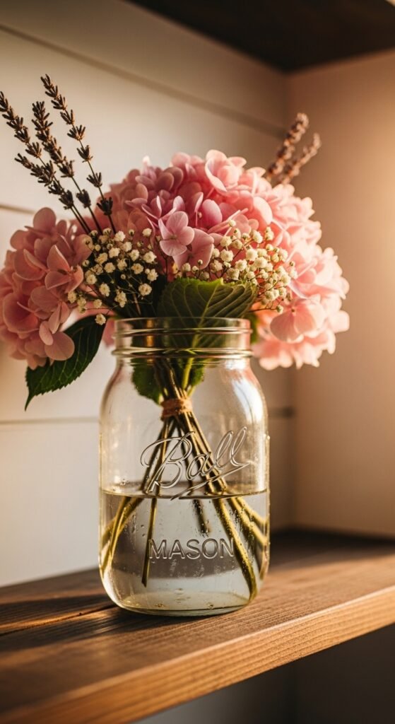 Mason jars make excellent hydrangea vases and cost almost nothing. The wide mouth supports large bloom heads without letting them flop over. Fill the jar about halfway with cool water and a tiny splash of apple cider vinegar to keep bacteria at bay. Arrange three to five stems with varied heights. Tuck in a few sprigs of baby’s breath or dried lavender for texture. This is a great DIY option for wedding centerpieces on a tight budget — one jar costs less than $1.
