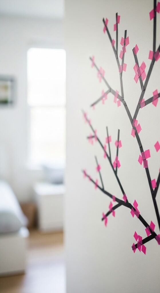 Use thin black washi tape to create branches on a white wall. Add small squares or circles of pink washi tape as blossoms. Build the branch from a lower corner upward, spreading it across the wall like a real tree.
