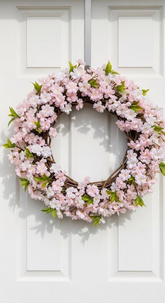 A cherry blossom wreath says “welcome” in the softest, most beautiful way. You can buy one pre-made for around $15–$30, or DIY it with a wire frame and faux bloom bunches from a craft store. Hot glue the flowers on in clusters for a full, lush look.