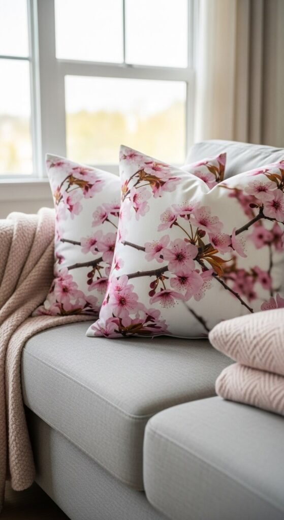 Swap out your current pillows for cherry blossom-print covers. You do not need to buy whole new pillows — just the covers. Sites like Amazon, IKEA, and H&M Home carry them for around $8–$20 each.