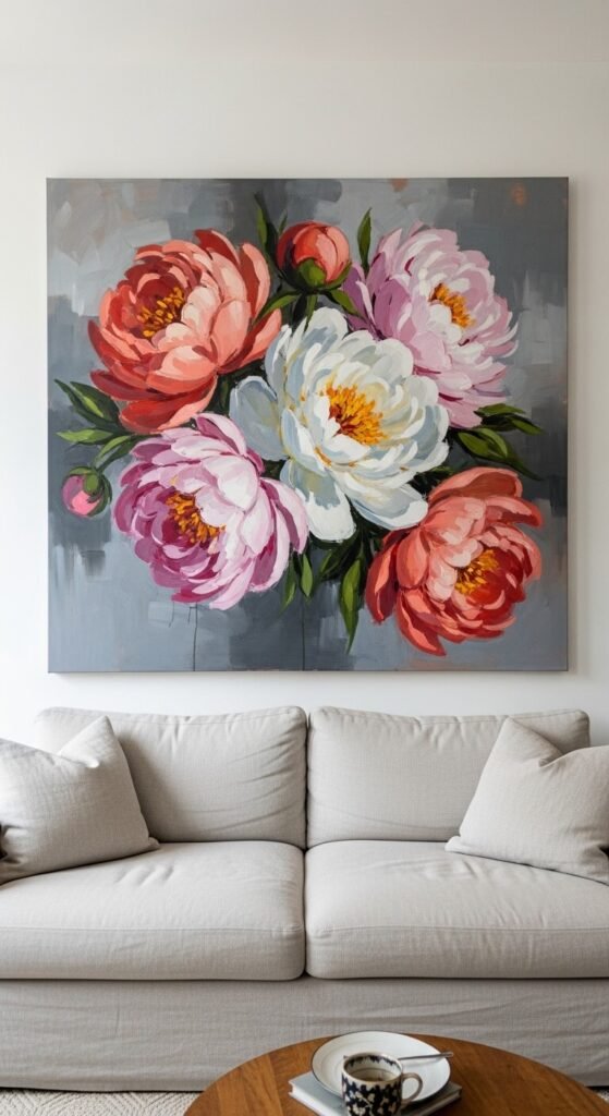 Commission an oversized floral painting from an Etsy artist — prices vary widely and many are surprisingly affordable. Or paint one yourself with acrylic paint and a large canvas from a craft store.
