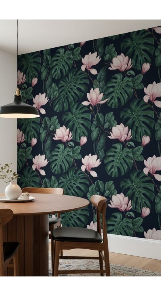 Choose one wall — ideally behind a sofa, bed, or dining table — and apply a bold floral wallpaper. Peel-and-stick versions require zero tools and no permanent commitment.