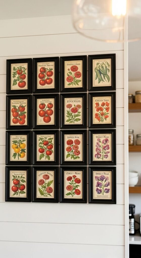 Print vintage seed packet designs (available copyright-free from the USDA archive and Etsy) and frame them in matching small frames. A grid of 9 or 12 looks incredibly curated.