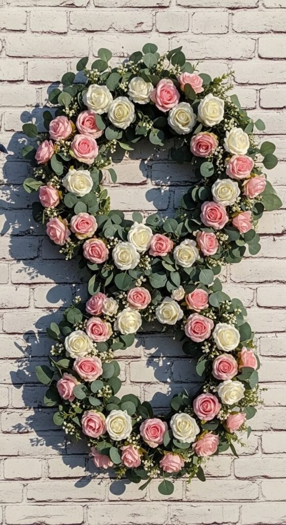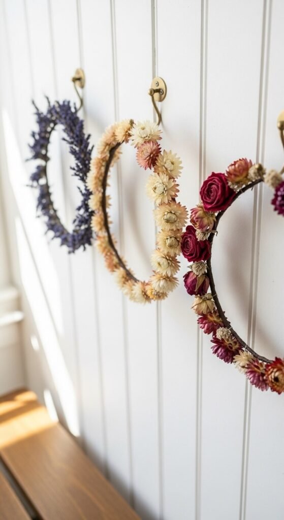 Buy faux flower wreaths at craft stores during sales — they’re often 40–50% off. Choose a consistent color palette but vary the sizes. Hang them overlapping slightly, like a cluster.