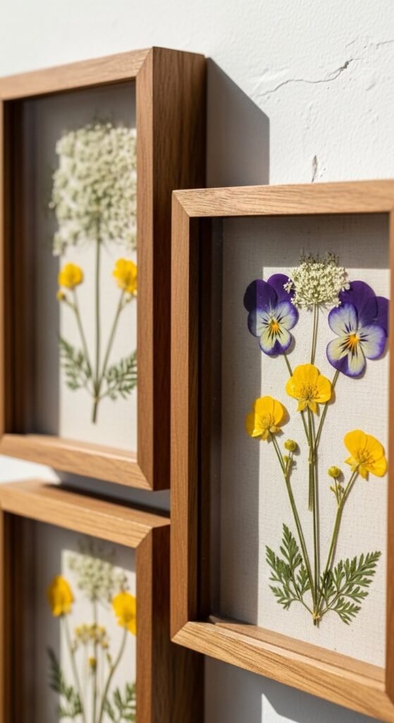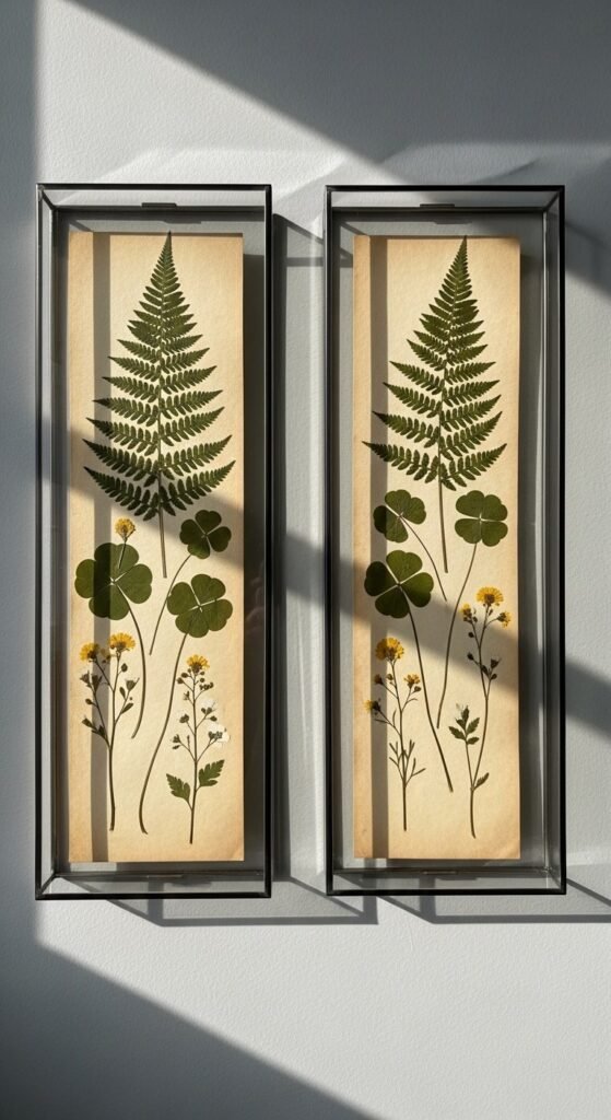 Use clip frames or floating glass frames so the pressed flowers appear to hover. Mount specimens on aged kraft paper or plain white cardstock. Mix ferns, clover, petals, and small branches.
