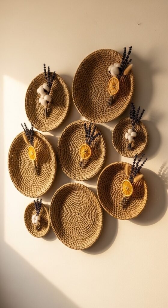 Use Command strips designed for heavy objects. Arrange in an organic cluster rather than a perfect grid. Cost: $5–$15 per basket depending on source.