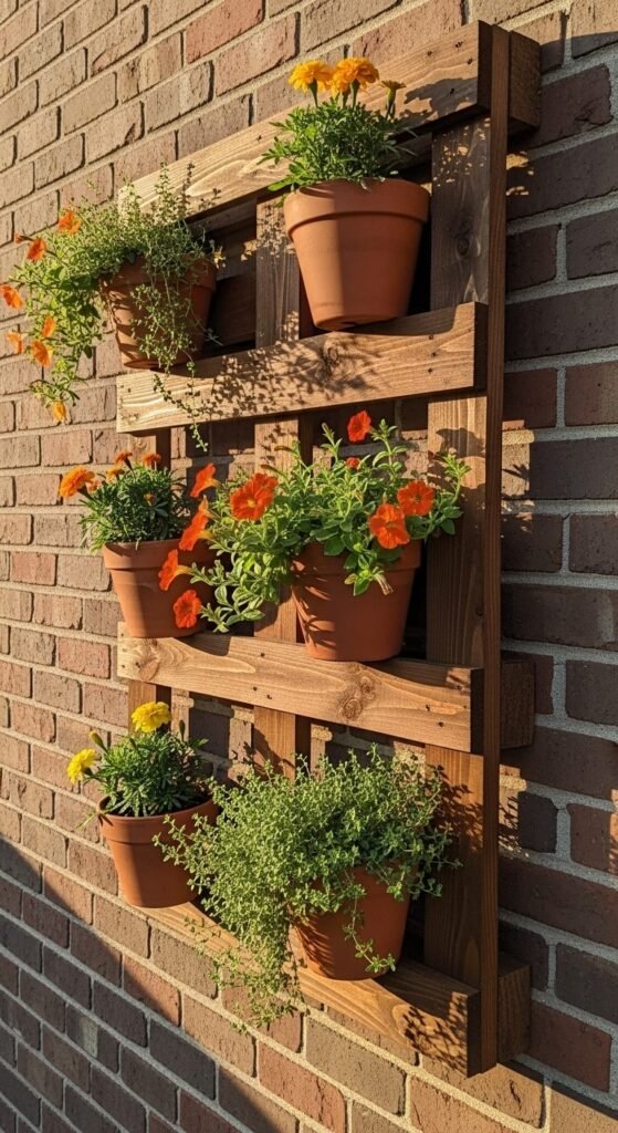 This works on patios, balconies, and garden walls. It’s an outdoor statement piece that grows more beautiful each week. Pallet cost: free or $5–$10. Plants: $2–$4 each.