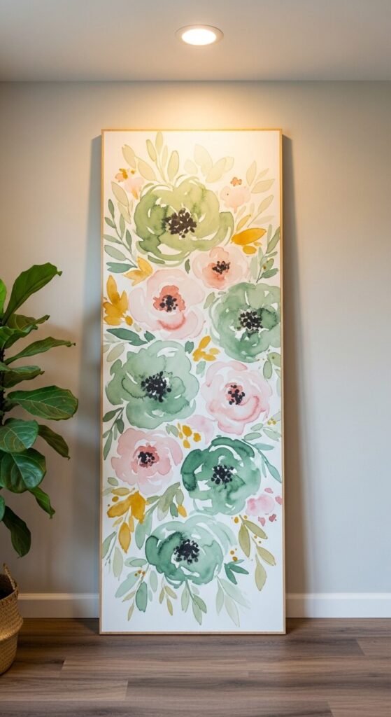 Lean it against the wall instead of hanging it for an effortless, gallery-style look. A 24×30 canvas from a craft store costs around $15–$20 unpainted.