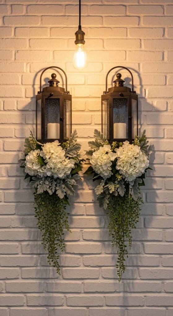 Mount two matching metal lantern sconces on either side of a mirror, fireplace, or bed. Remove any candle inserts. Pack faux florals inside tightly — white hydrangeas and trailing greenery fill space beautifully.