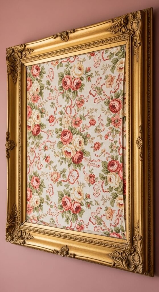 Find vintage floral chintz, toile, or brocade at thrift stores, estate sales, or fabric remnant bins. Stretch it taut over a piece of foam board or cardboard. Slide it into a large ornate frame.