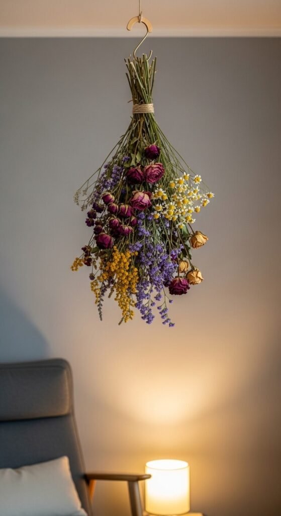 Bundle dried flowers — roses, chamomile, statice — and tie them to a ceiling hook so they hang down above a chair, table, or bed. The wall behind becomes a natural backdrop.