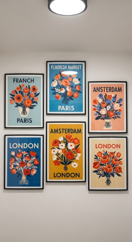 Go for muted or vintage color palettes — French blue, mustard, cream — rather than bright primaries. Printing cost: $1–$3 per poster. Frames from a dollar store: $2–$5 each.