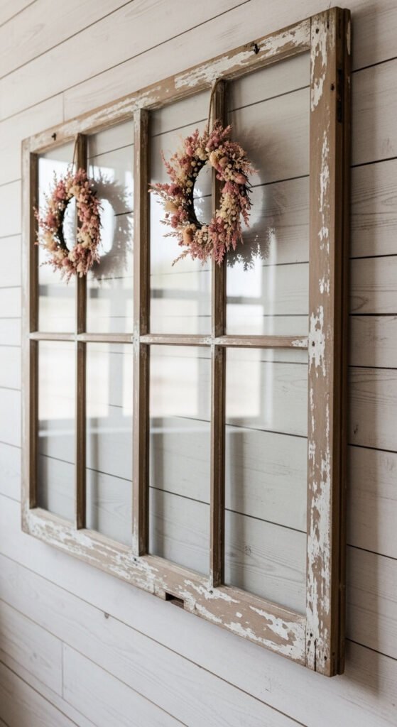 This works beautifully in farmhouse, cottage, and rustic interiors. A salvage window frame typically costs $10–$30. Wreaths from craft stores: $5–$15 each.