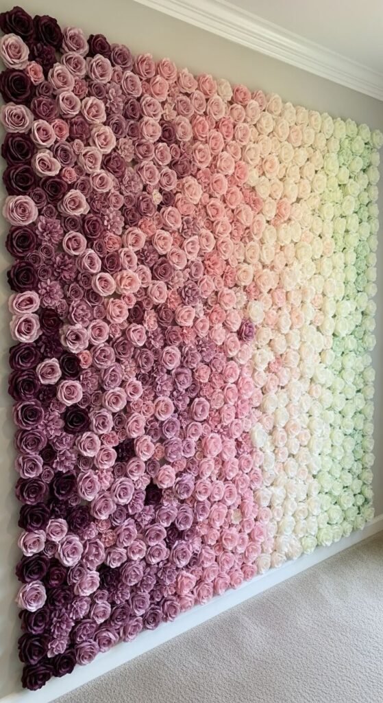 Buy bulk faux flower heads in varying shades of one color — deep plum through blush to ivory, or navy through teal to mint. Remove stems. Arrange on the wall from dark to light in a gradient.