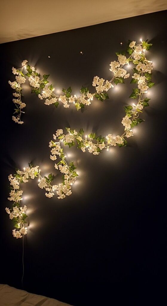 Buy artificial trailing ivy or vine garlands and small faux flower clusters — cherry blossoms, wisteria, and jasmine all work beautifully. Layer with warm white string lights. Pin loosely to the wall in a cascading arrangement.