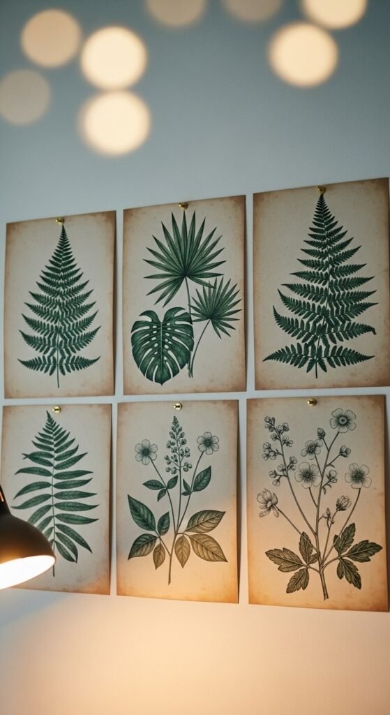 Mix ferns, tropical leaves, and wildflowers for variety. A set of five prints can fill an entire wall for under $15 in printing costs.
