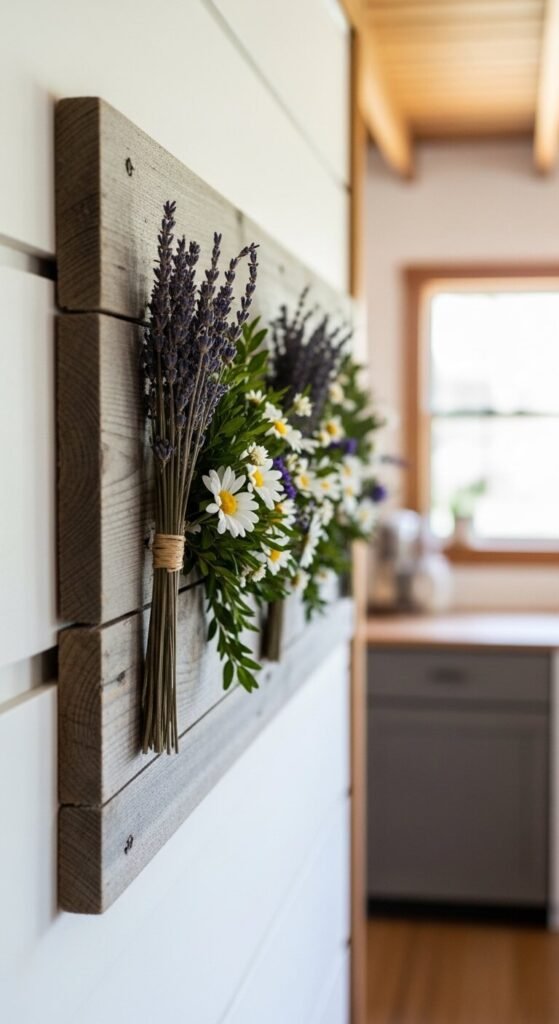 Find a reclaimed plank at a salvage shop, Habitat for Humanity ReStore, or even a lumber yard offcut bin. Sand it lightly. Arrange dried flowers, herbs, or faux stems directly onto the surface using hot glue.
