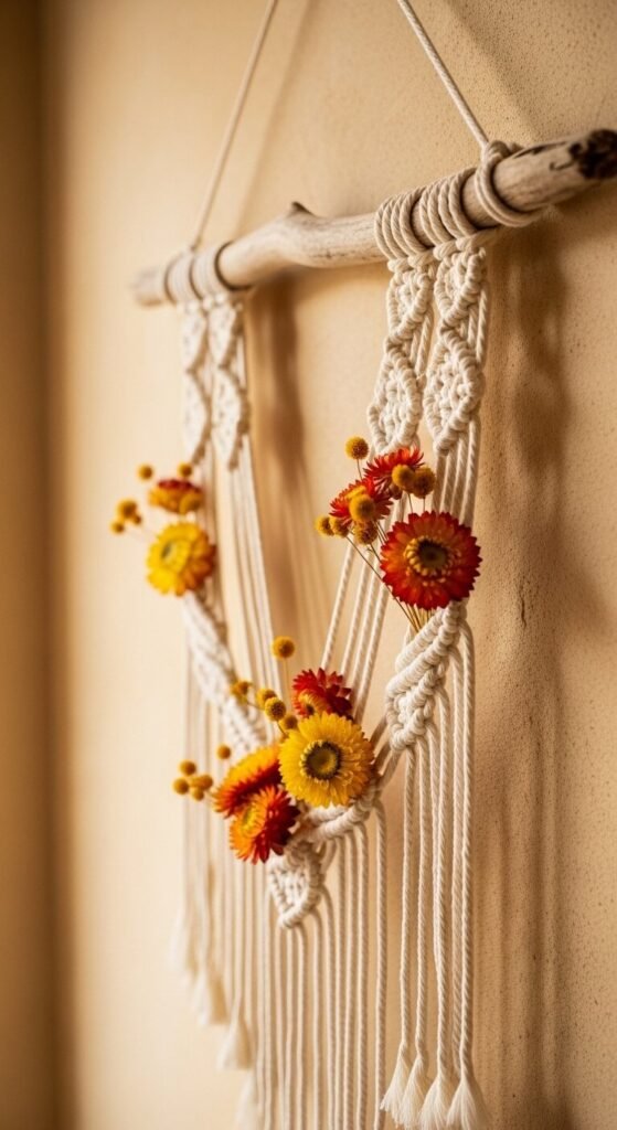Basic macramé kits are inexpensive and beginner-friendly — tutorials are free on YouTube. Once knotted, tuck small dried flower clusters like strawflowers, statice, or baby’s breath into the weave.