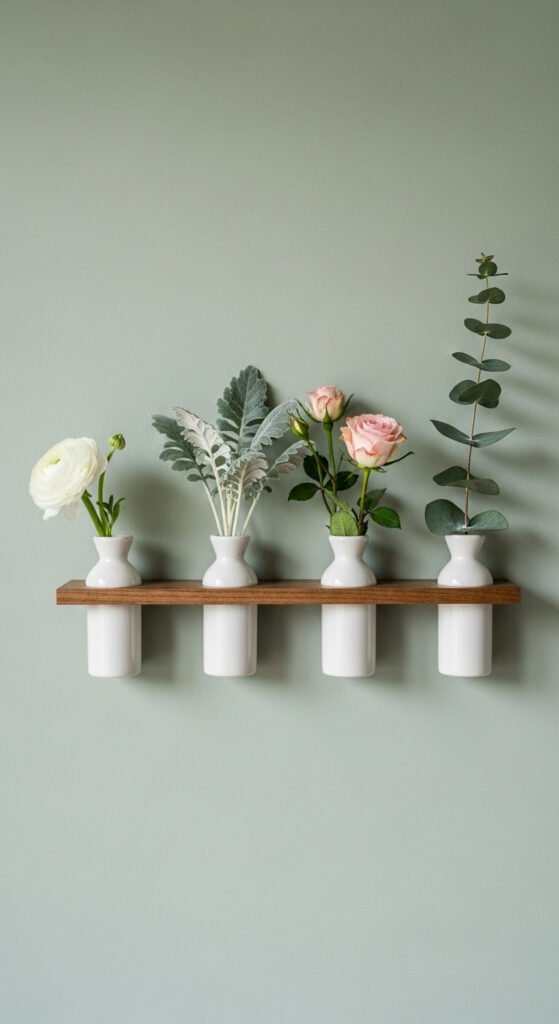 Install three to five small floating shelves in a horizontal row. Place a single bud vase on each. Swap fresh stems weekly from your garden or the grocery store floral section.