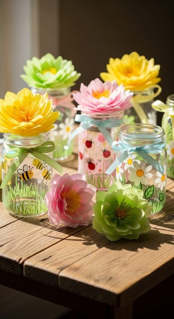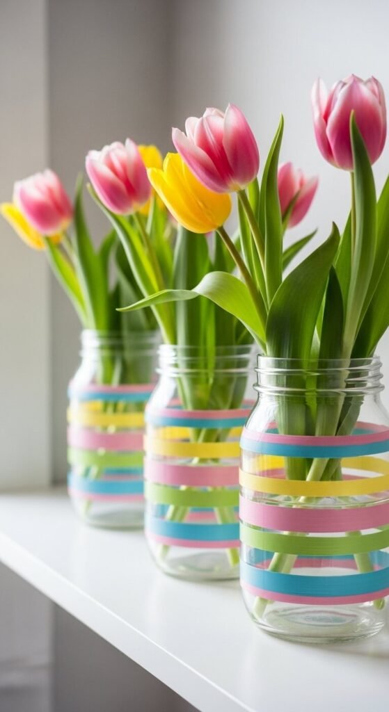 Wash and dry jars completely before starting. Wrap painter’s tape around the jar in even sections. Paint between the tape with spring colors like mint, coral, or buttercup yellow. Let dry for 30 minutes, then peel away the tape.