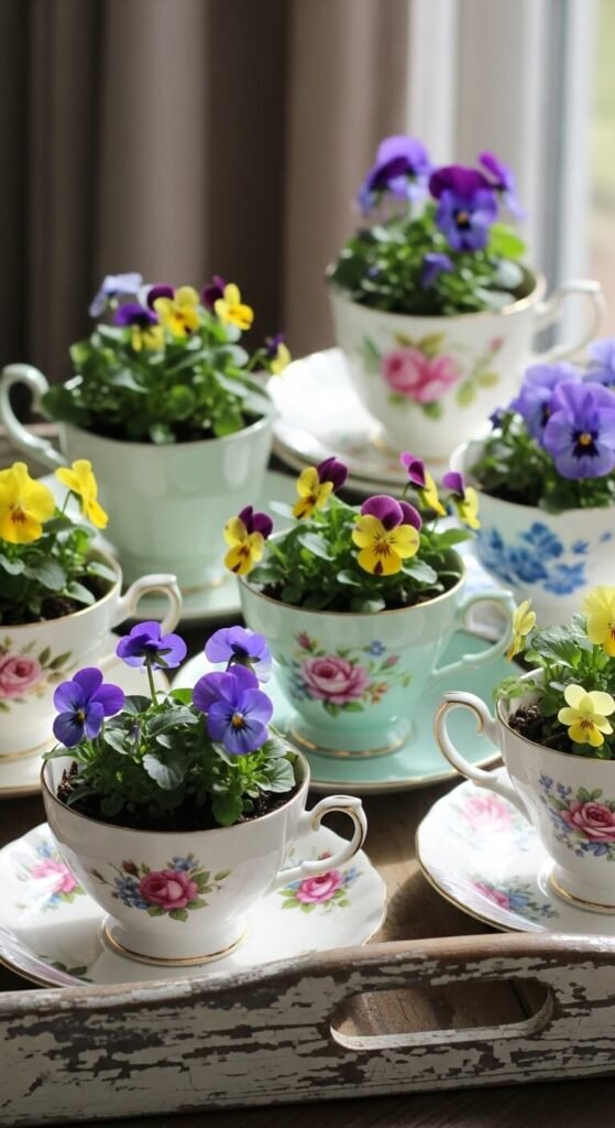 Ensure cups have drainage by adding pebbles at the bottom. Fill with potting mix and small flowers like pansies or violas. Group several together.