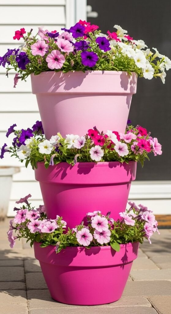 This saves ground space while adding height to patios. Petunias, lobelia, and sweet potato vine work well. Water the top pot and it drains to lower levels. Secure with plant stakes if stacking high.