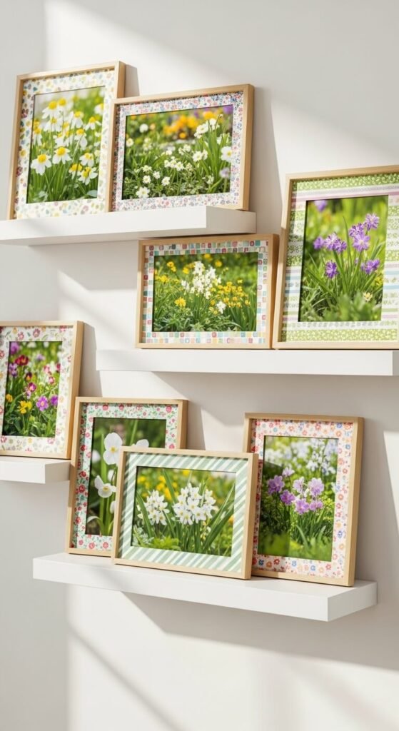 Print photos at home or use a drugstore for cheap prints. This works for kids’ artwork too. Paint clothespins in spring colors for extra flair. Space clips evenly for a clean look. Takes five minutes to assemble.