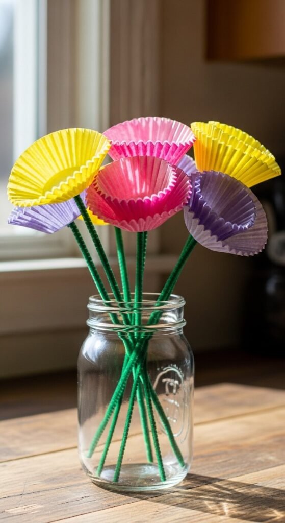 Flatten cupcake liners and layer three together. Poke a pipe cleaner through the center. Twist the liner around the stem to create petals. Add a button center.