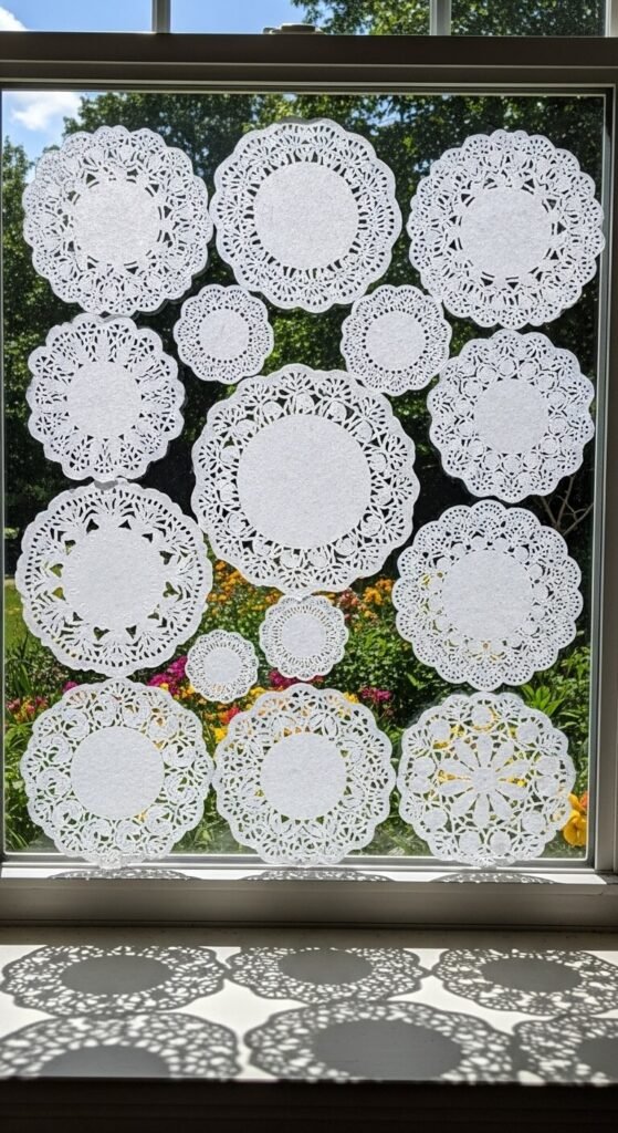 The dried glue becomes translucent and holds doilies in place. Light creates beautiful patterns. Peels off easily with warm water when you want to change. Try different sizes and patterns. Perfect for renters or seasonal changes.