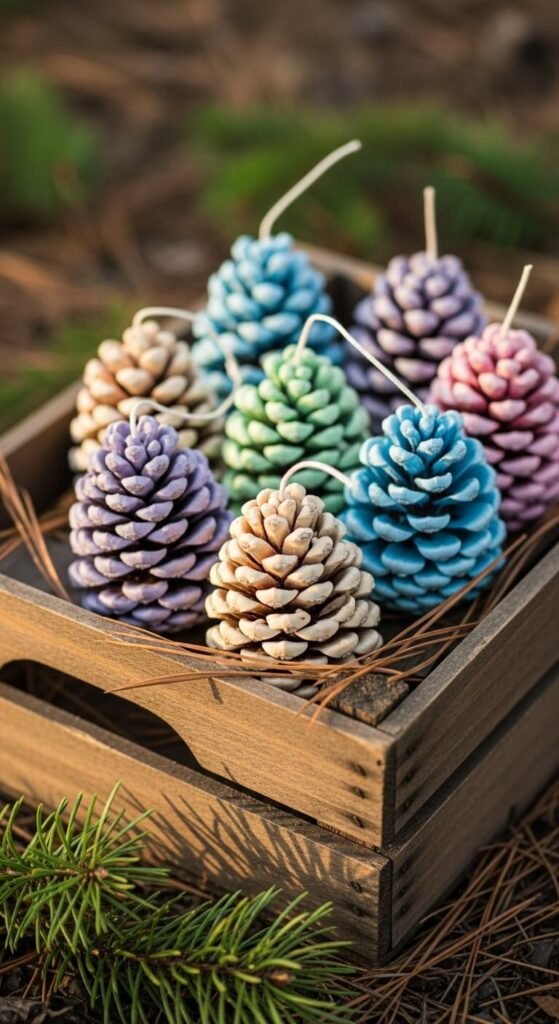 Tie a wick or cotton string to each pinecone. Melt old candle wax or paraffin in a double boiler. Dip pinecones in colored wax. Let cool on wax paper.