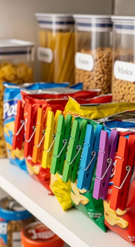 Paint wooden clothespins with acrylic paint in your kitchen colors. Let dry completely. Use to seal snack bags, coffee bags, or paper packages.