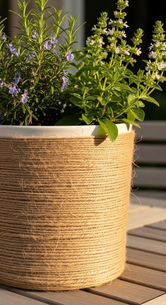 This hides damaged or outdated pots instantly. Creates a natural, organic look. Use different colored twine for variety. The texture adds visual interest to porches. Seal with clear spray if using outdoors to prevent fraying.