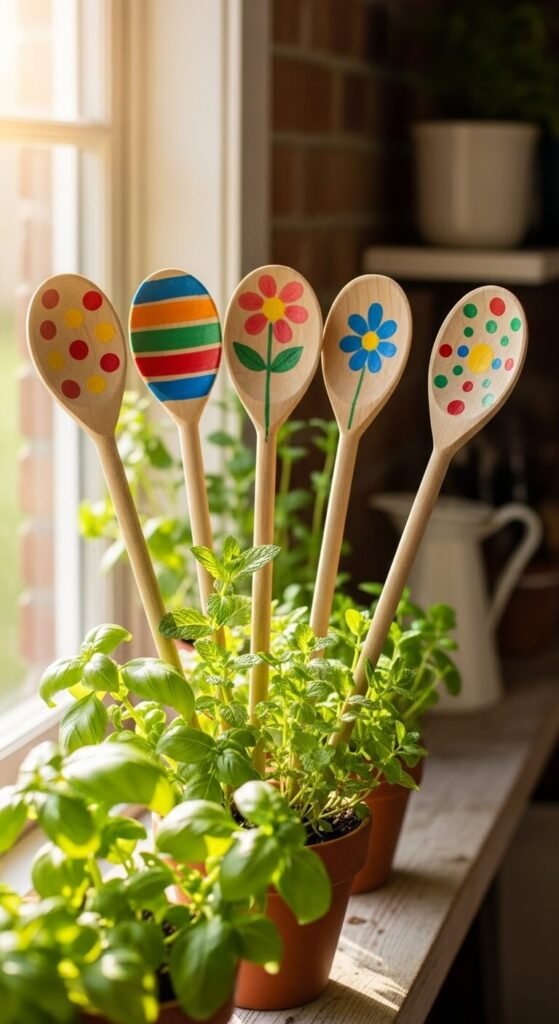 These work for tomatoes, peppers, or flowering plants. The painted ends add color to greenery. Kids enjoy the painting part. Label plants by writing names on the handles instead. Beats plain wooden stakes for visual appeal.