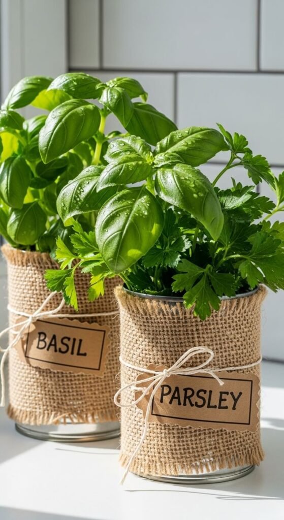Punch drainage holes in the bottom using a hammer and nail. Wrap cans with burlap, twine, or fabric scraps. Secure with hot glue. Fill with potting soil and herb seedlings.