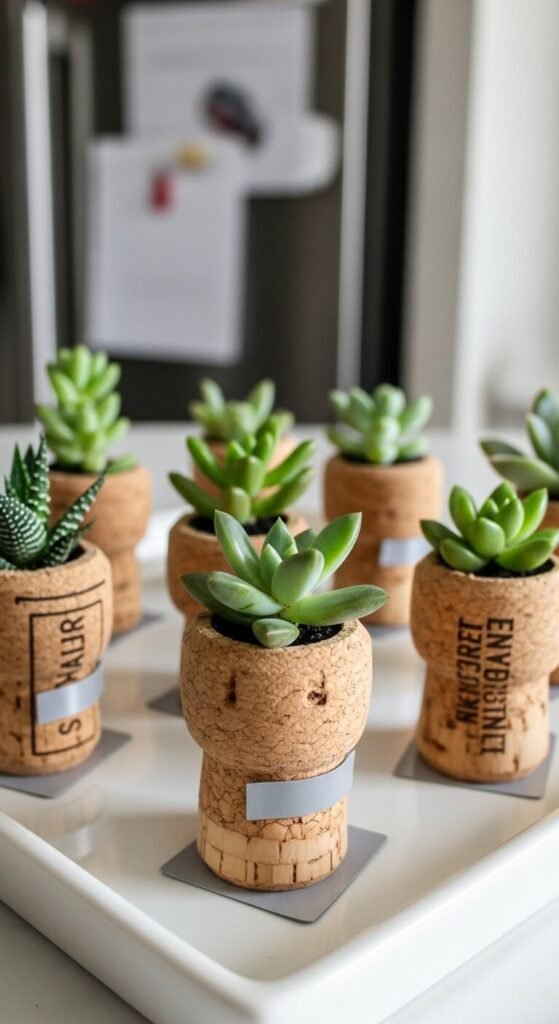 Cut corks lengthwise for a flat surface. Glue small succulent cuttings on top. Attach magnetic strips to the back with strong adhesive.