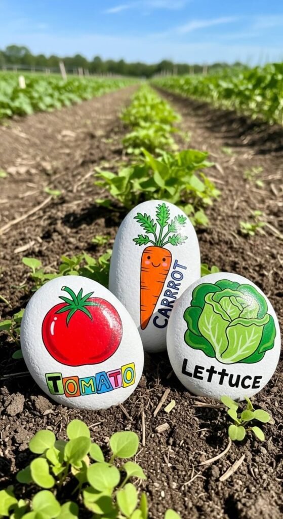 Wash rocks and let dry. Paint with white acrylic as a base coat. After drying, write plant names or draw simple vegetable icons. Seal with clear coat.