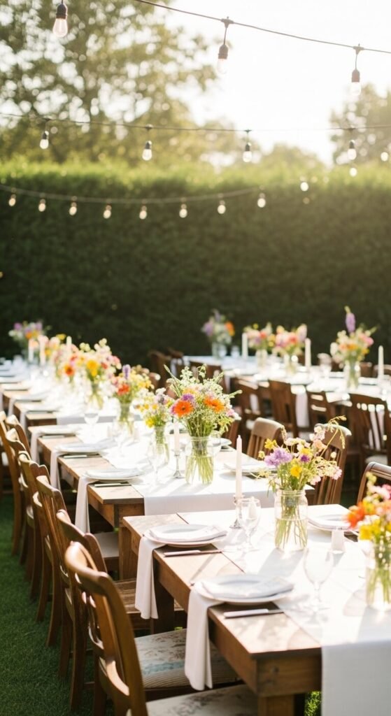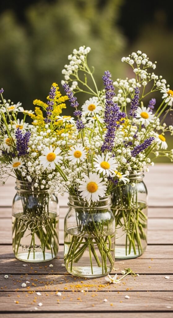 Skip the florist and pick up wildflowers from a farmers market or grocery store. Mason jars make perfect vases — and you probably already own some. Tie a strip of twine or burlap around the neck for a finished look. Mix heights by using different jar sizes. Three jars grouped together per table looks intentional and full. This entire centerpiece idea can cost under $5 per table. Simple, seasonal, and genuinely beautiful.