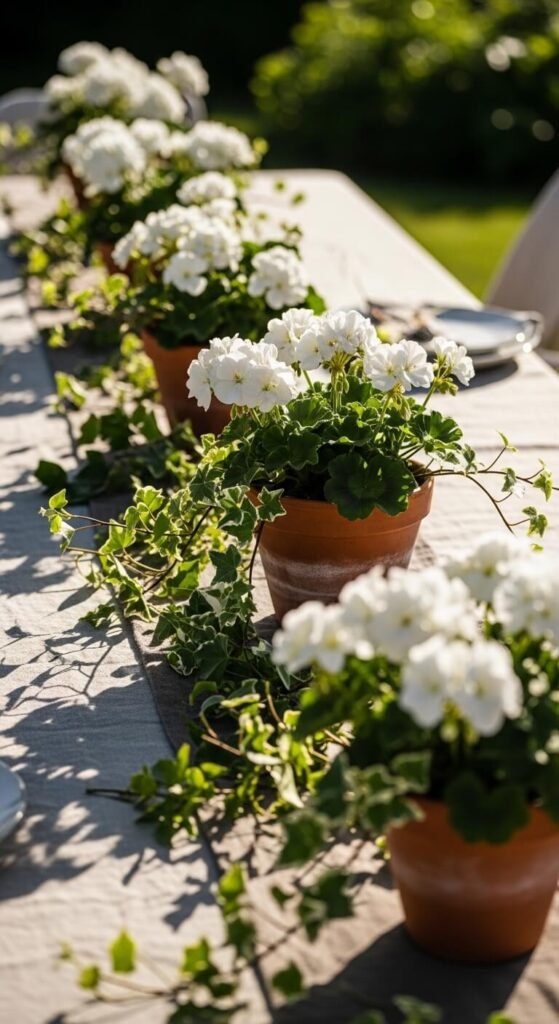 Instead of cut flowers that wilt, use potted plants as centerpieces. Small terracotta pots with herbs or flowering plants stay fresh all day and double as guest favors at the end. Group three pots of different heights together for each table. Add a little moss or river stones around the base for a finished look. Nurseries and home improvement stores often sell small plants for $2 to $4 each. Practical, long-lasting, and genuinely lovely.